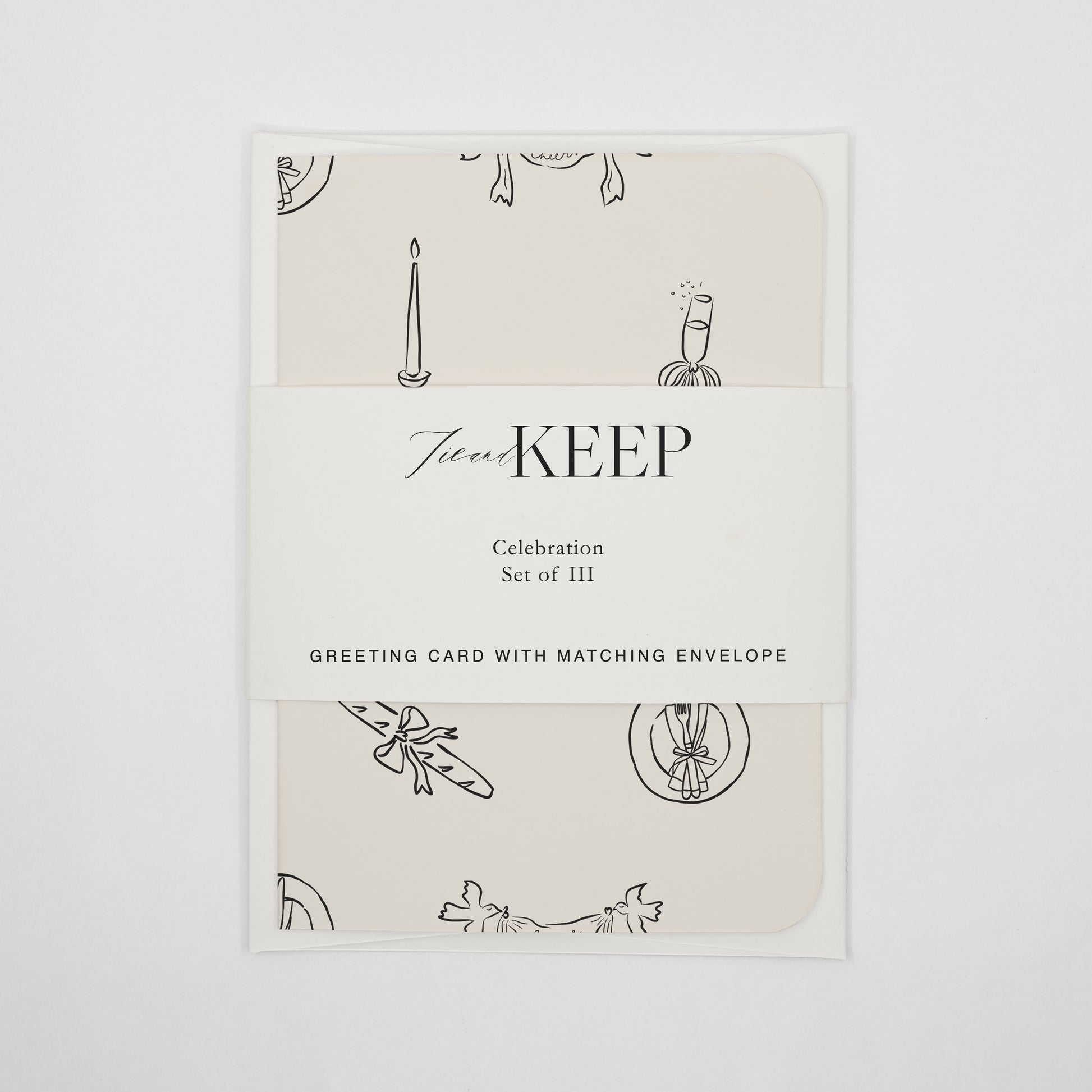 Tie and Keep’ in küçük stüdyosunda basılan tebrik kartları ve kurdele ile tamamlanacak biçimde tasarlanan, eşleşen zarflar; tebrik ve kutlama notlarını, küçük bir hediyeleşme ritüeline dönüştürmek ve saklanabilir kılmak üzere, özel olarak üretildi.